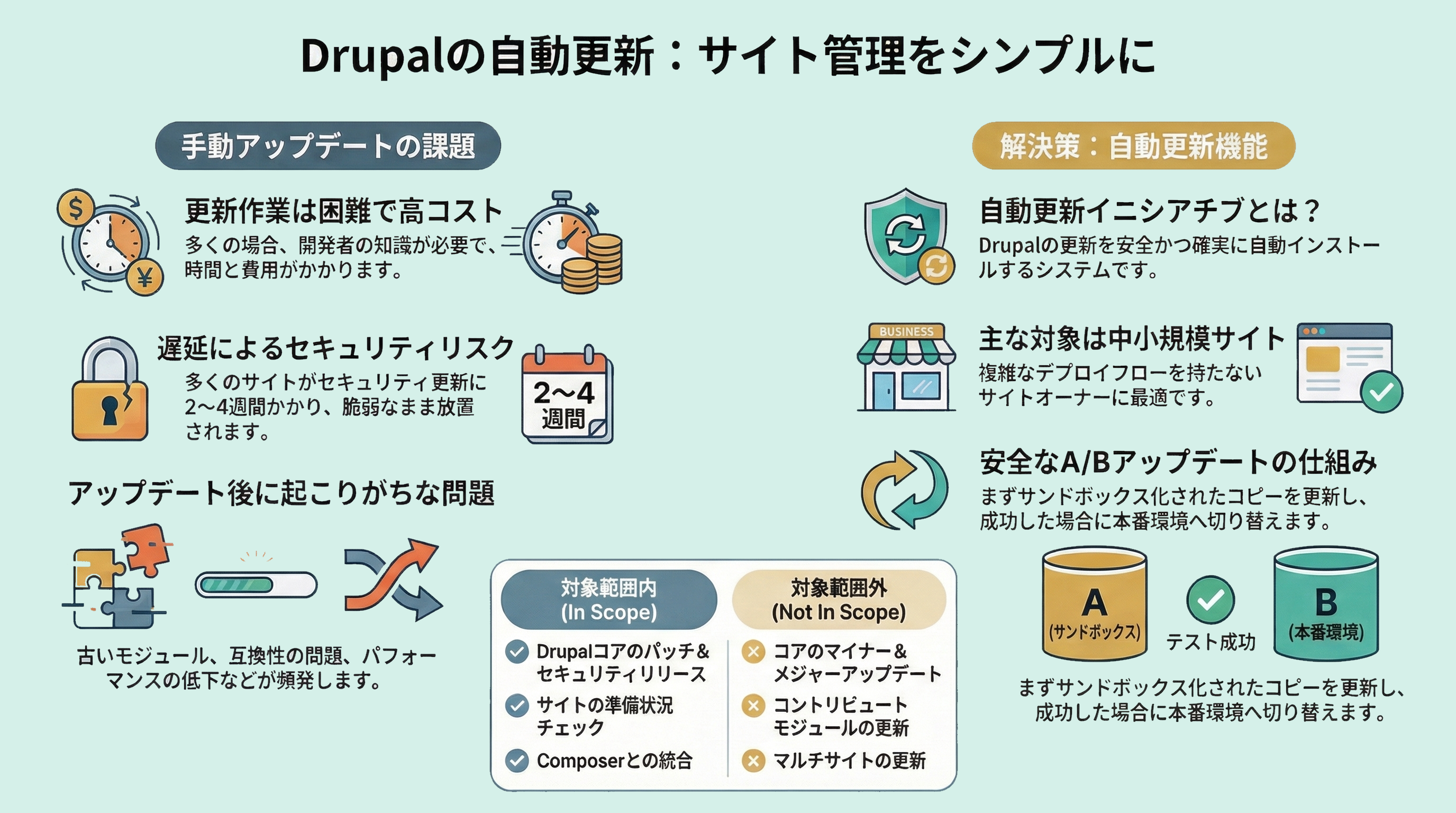 Drupal の自動更新機能(Automatic Updates)は、サイト運用の技術的ハードルとコストを劇的に削減し、セキュリティリスクを最小化するために設計された革新的な機能です。
